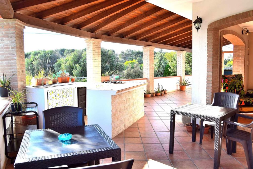 The villa, Mi casa es tu casa 79, located in Southwest Sardinia, features three double bedrooms, two bathrooms, a kitchen, and a living room. Outside, a veranda of over 80 sqm includes a lounge area, built-in peninsula kitchen, fridge, tables, and chairs.